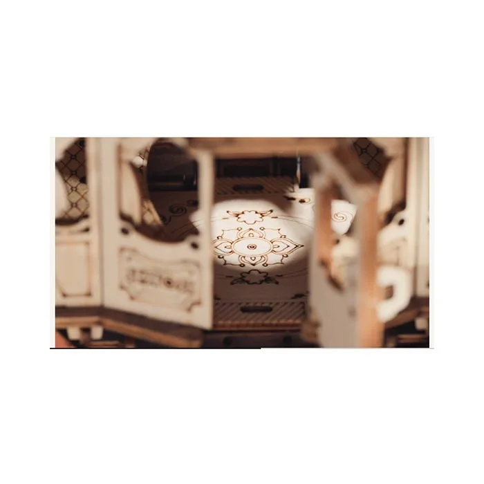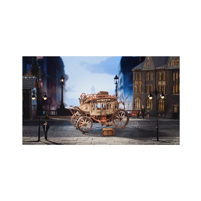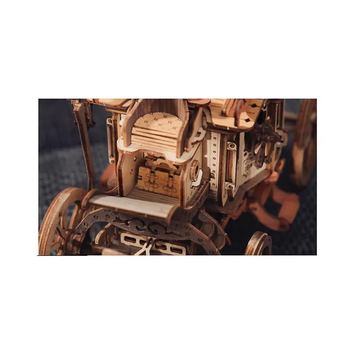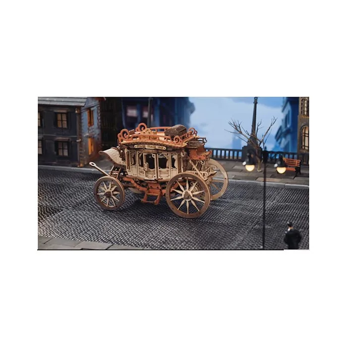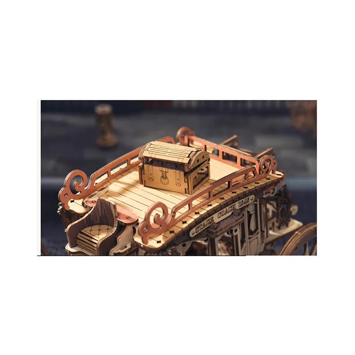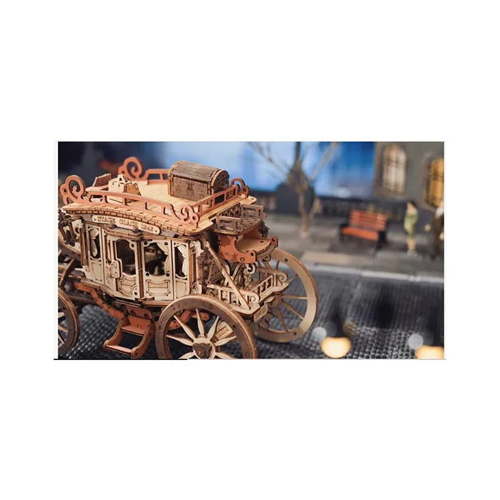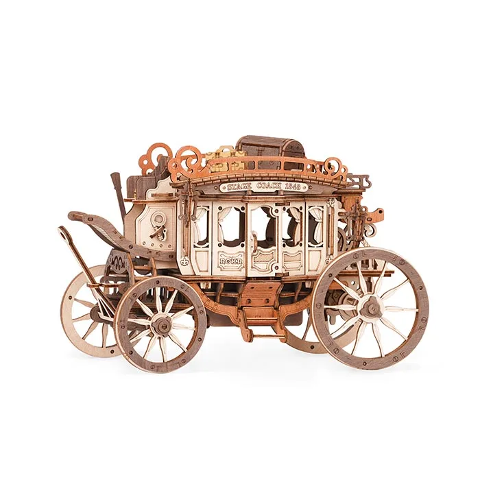 A charming and intricate 3D wooden puzzle that doubles as a functional music box, designed in the shape of a vintage stage coach.