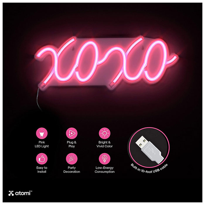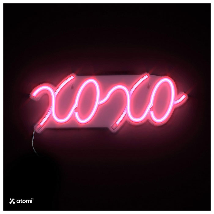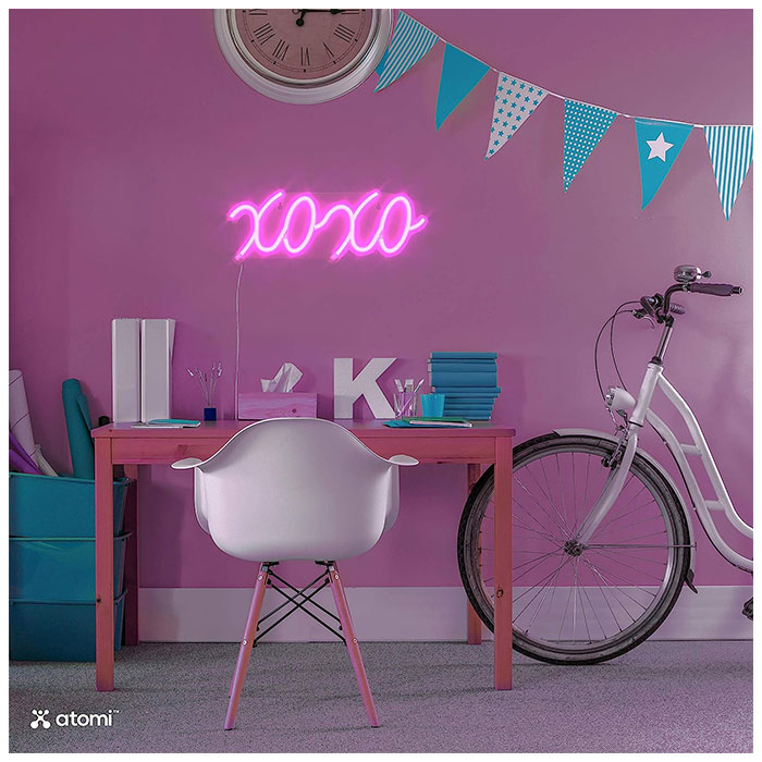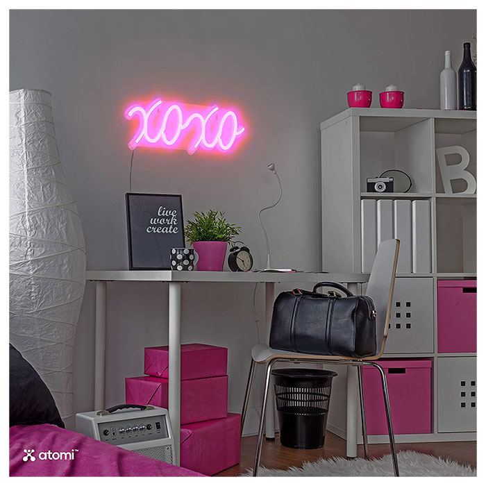 Let your sense of style shine through with the atomi XOXO- Pink Neon Light. This trendy LED light is a fun home accessory, adding instant personality to any room. Easy to install and safe to use, it is cool as a gift, as wall art, or a tabletop decoration. It is perfect for illuminating dorm rooms, bedrooms, the family room, kids rooms, outdoor areas, and luau theme events!