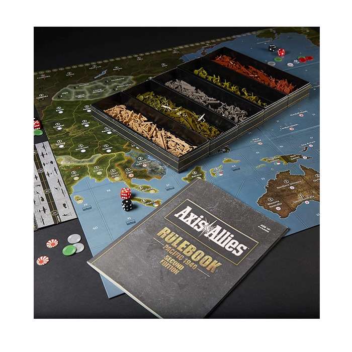 Axis and Allies: Pacific 1940 features an oversized board that measures 35″ x 32″. With over 450 pieces, deluxe game components and local storage boxes, this game raises the standard established by the Axis and Allies Anniversary Edition.