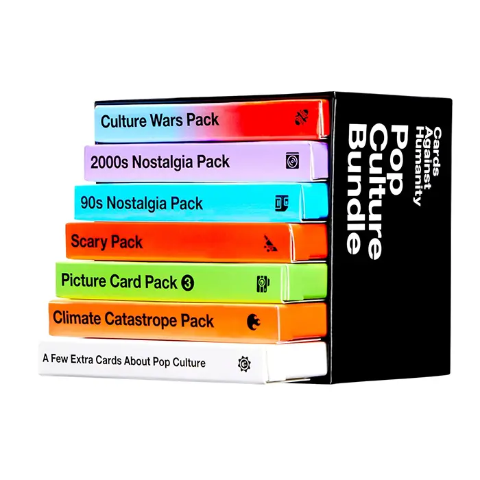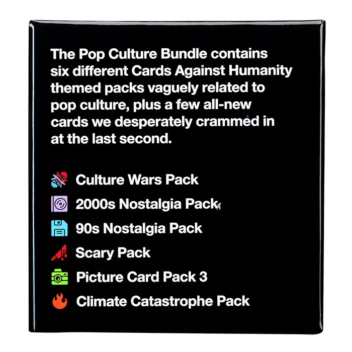 The Pop Culture Bundle comes with six different themed packs vaguely related to pop culture that you forgot to buy when they came out, plus ten all-new cards we desperately crammed in at the last second. Cards Against Humanity is a party game for horrible people. The game is simple. Each round, one player asks a question from a black card, and everyone else answers with their funniest white card.