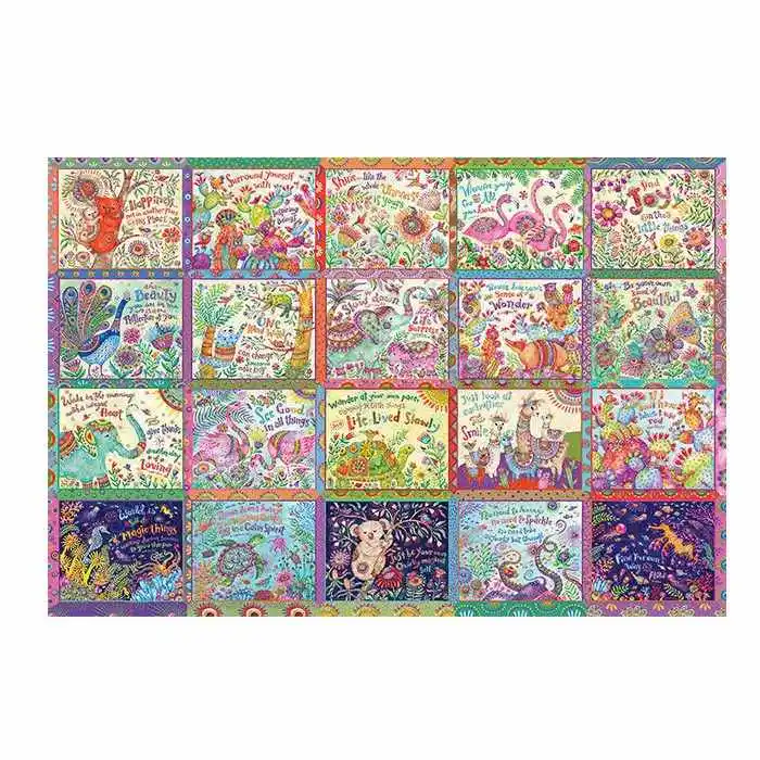Happy Thoughts is a vibrant explosion of colors! As you piece together this whimsical 2000 piece puzzle by Debi Hron, you’ll uncover inspirational quotes that remind us to wander at your own pace. Featuring an array of delightful wildlife illustrations, from adorable koalas and silly sloths to bird bearing turtles, outreaching octopus, and fluttering butterflies – this puzzle is a joyful celebration of slowing down to let life surprise you.