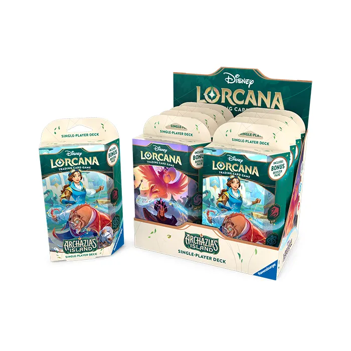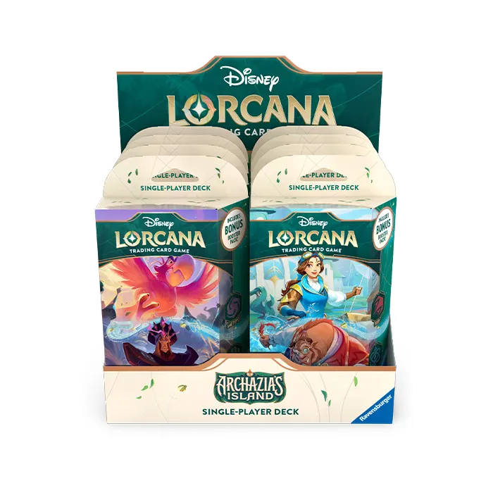 Want to start playing Disney Lorcana as soon as possible? Then all you need is a deck of 60 cards. A starter deck is the ideal start because this is a ready-made deck that can be played straight out of the box. A starter deck comes with a number of game tokens to use during the game and a booklet with explanations. In addition, a starter deck contains a booster pack of Archazia’s Island to add new cards to your collection or to give your deck an upgrade.