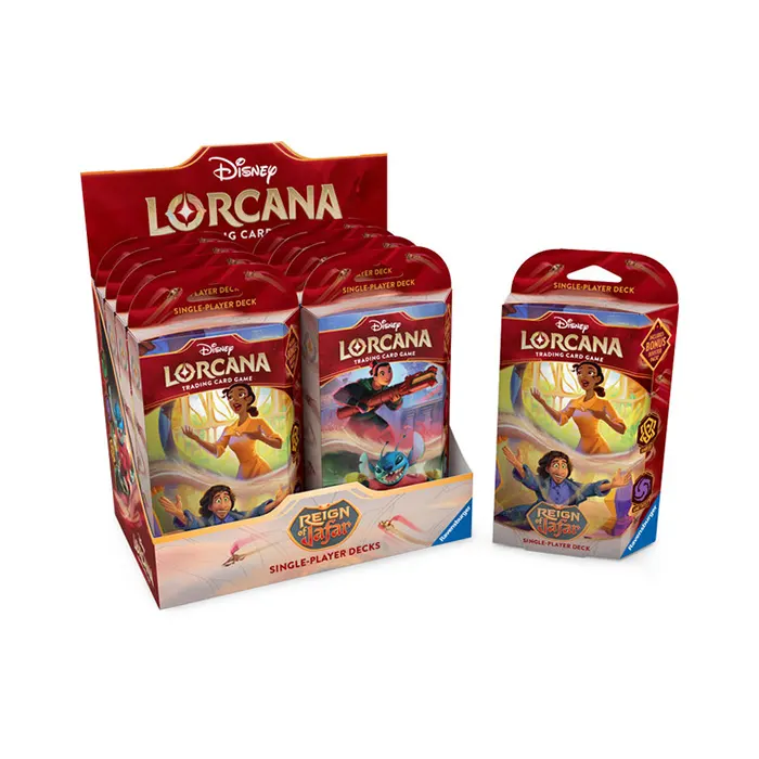 Each Reign of Jafar Starter Deck Display contains 8 starter decks, 4 of each type. To play Disney Lorcana, each player will need a deck of sixty cards. Ready-to-play starter decks contain a preconstructed deck with a specific card list. If you’re new to trading card games, or if you want to experience the game with a deck designed and tested by Team Lorcana, this is a good place to start.