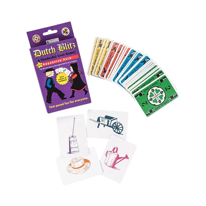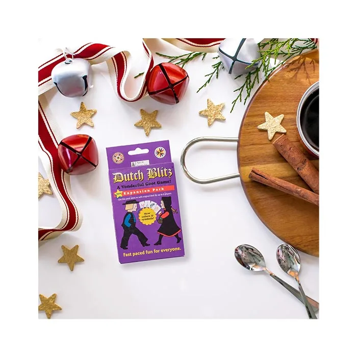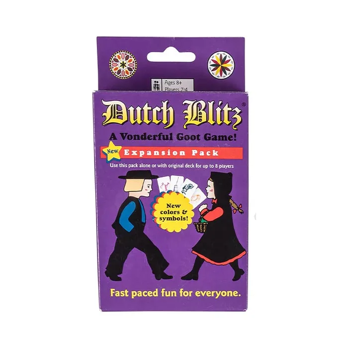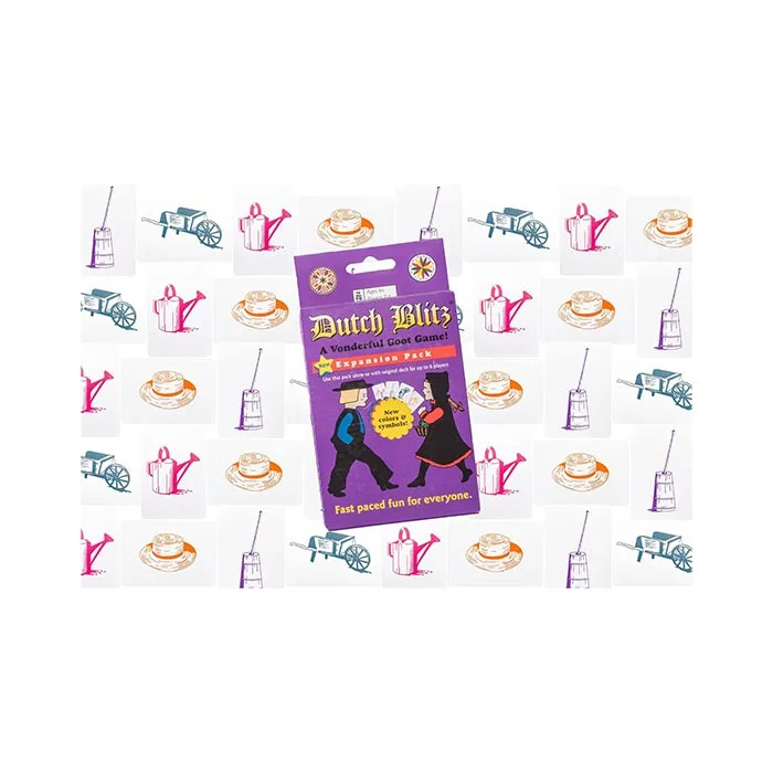 The Purple Expansion Pack is a limited edition of the Wonderful Good Classic Green game, allowing up to 8 players. You can play with 4 players using just the Purple pack or combine it with the Green pack for up to 8 players. The Purple pack is a redesigned version of the Classic Green, with different deck colors. The gameplay involves quickly getting rid of your 10-card Blitz pile by placing cards in sequence and matching colors on the center Dutch piles. The first to exhaust their Blitz pile wins.