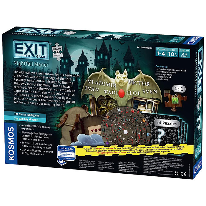 The old man was well-known for his eerie tales of the dark castle on the edge of the forest. Recently, he set out on his own to find the shadowy lord of the manor, but he hasnot returned. Fearing the worst, you embark on a quest to find him. You must solve a series of riddles and piece together four jigsaw puzzles to uncover the mystery of Nightfall Manor and save your missing friend