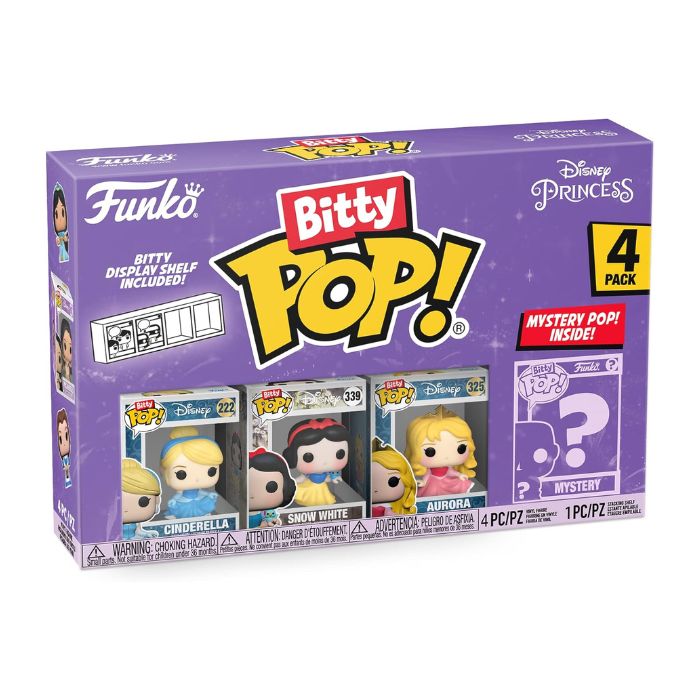 Your beloved Disney Princess Pop! figures have been reimagined as Bitty Pops! Enhance your collection with this set of miniaturized Bitty Pop! figures featuring your favorite royal heroines. This 4-pack includes Bitty Pop! versions of Cinderella, Snow White, Aurora, and a mystery Bitty Pop! figure.