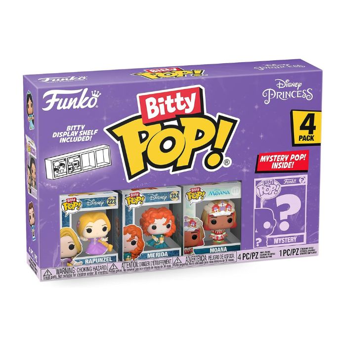 Your beloved Disney Princess Pops! are now available as Bitty Pops! This 4-pack includes miniaturized versions of Rapunzel, Merida, Moana, and a mystery figure. Potential mystery Bitty Pops! include Belle, Coronation Elsa, Ariel, and Coronation Anna. Packaged in hard acrylic cases, these vinyl figures are approximately 0.9 inches tall. Warning: Choking Hazard. Not suitable for children under 3 years old. Item selection is random, and duplicate figures may be received.