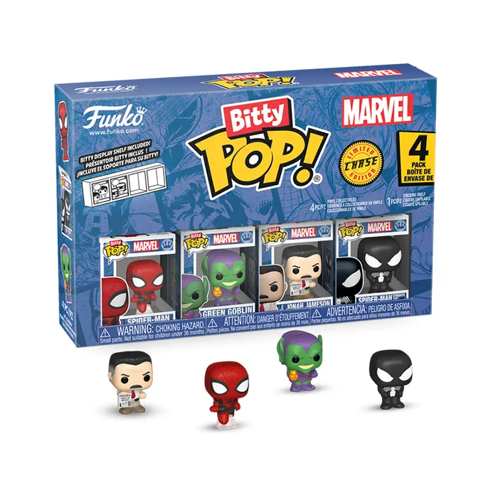The world of POP! is getting bigger – and smaller – with Bitty POP! collectibles! Expand your Marvel collection with this 4-pack featuring Bitty POP! Spider-Man – First Appearance, Bitty POP! Green Goblin, Bitty POP! J. Jonah Jameson, and a chase Bitty POP! collectible. The possible chase Bitty POP! collectibles are Rare (1/3) Spider-Man – Stealth Suit, Rare (1/3) Spider-Man – Symbiote Suit, Hyper Rare (1/6) Peter Parker, and Hyper Rare (1/6) Spider-Man – Spotlight.