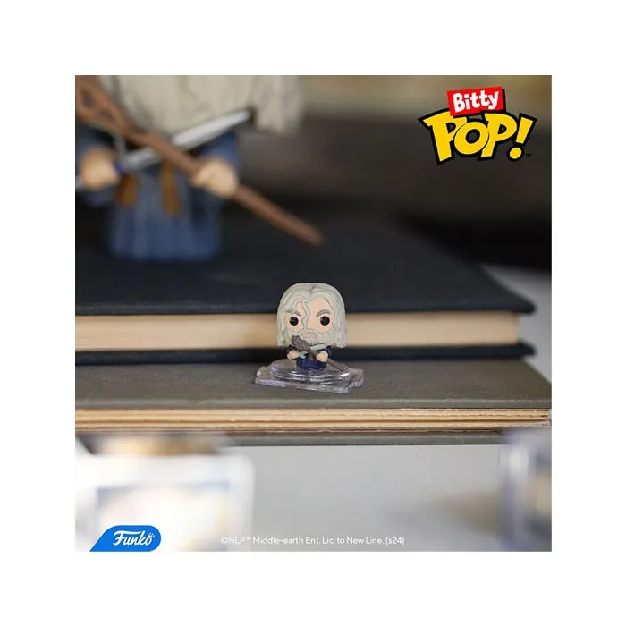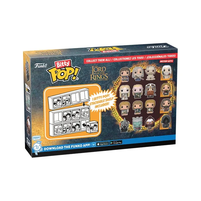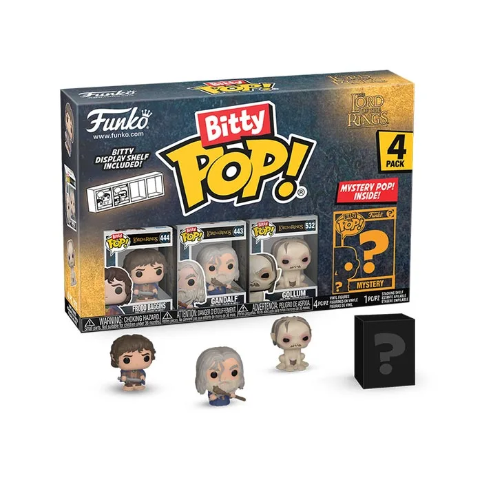 Introducing Bitty Pops!, miniature versions of your beloved The Lord of the Rings characters. This 4-pack includes Frodo Baggins, Gandalf, Gollum, and a mystery character (Rare Aragorn, Rare Nazgul, Hyper Rare Boromir, or Hyper Rare Saruman). Packaged in acrylic cases doubling as display bases, these 0.9-inch tall vinyl figures come with stackable cases, perfect for organizing your collection.