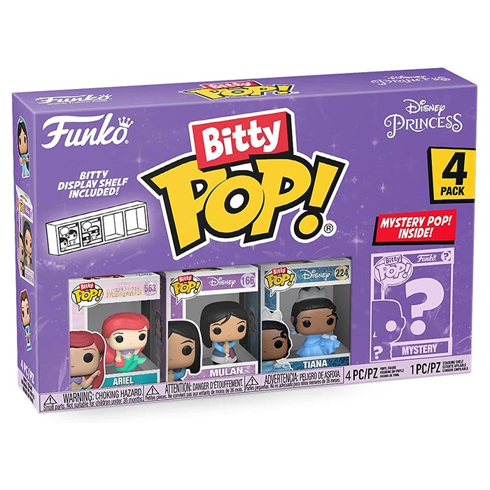 Your favorite Disney Princess Pops! have been transformed into Bitty Pops! Expand your collection with this assortment of Bitty Pop! figures featuring your most beloved, royal heroines as miniaturized figures! This 4-pack includes Bitty Pop! Ariel, Bitty Pop! Mulan, Bitty Pop! Tiana, and a mystery Bitty Pop! figure. The possible mystery Bitty Pops! are Hyper Rare (1/6) Belle (yellow dress), Hyper Rare (1/6) Coronation Elsa, Rare (1/3) Ariel (pink dress), and Rare (1/3) Coronation Anna. Bitty Pops! are packaged in hard acrylic cases with detachable bottom lids.