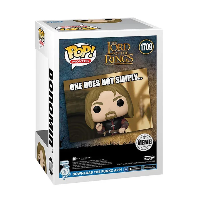 One does not simply overlook Pop! Boromir Commemorate a pop culture sensation when you make this One does not simply Pop! Boromir the next addition to your council of Pop! Memes. Expand your The Lord of the Rings lineup by reuniting this warrior of Gondor with the rest of the Fellowship in your collection. Vinyl figure is approximately 3.65-inches tall.