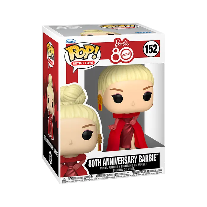 Roll out the carpet in your collection for this stunning POP! 80th Anniversary Barbie™! Celebrate the 80th Anniversary of Mattel® by welcoming this glamorous icon to your Retro Toys lineup! Vinyl figure is approximately 4.8 in (12.2 cm) tall.