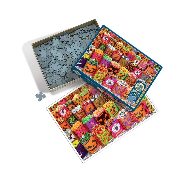 This colourful 500 piece Halloween Treats puzzle makes you want to stick your hand in a goodie bag and eat up all the sweets! Each goodie bag is decorated with a Halloween theme like pumpkins, bats, ghosts, spiders, and witches. The bags have delicious treats like chocolate skulls, candy corn, jujubes, jelly beans, gummy worms, and other candy confections that are definitely a treat – the only trick is you can’t really eat it. Boooooo!