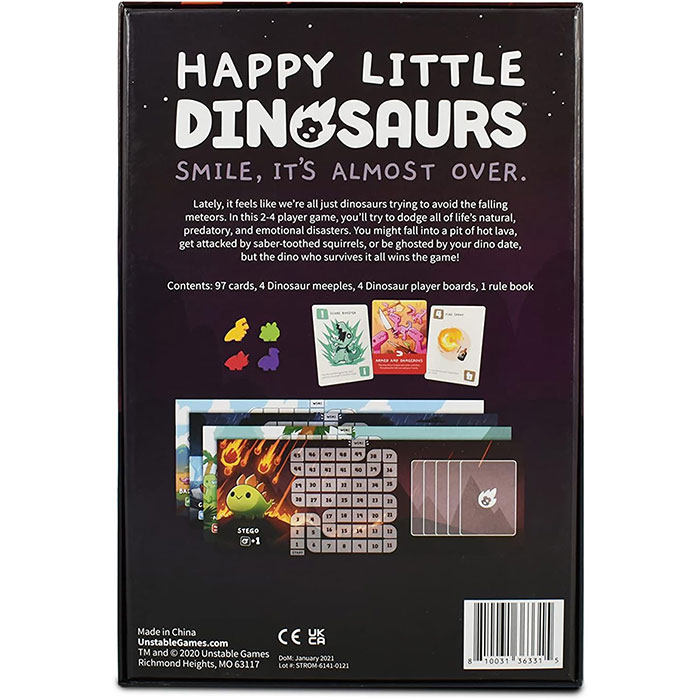 In Happy Little Dinosaurs Base Game, the first person to reach 50 points, or be the last Dinosaur standing, wins the game! During each round, you’ll flip a Disaster card featuring a Natural, Predatory, or Emotional disaster. Each player will play a Point card in hopes of collecting points and avoiding the disaster. Will you successfully dodge the disasters or get eaten by a prehistoric whale? Only the cards can decide…