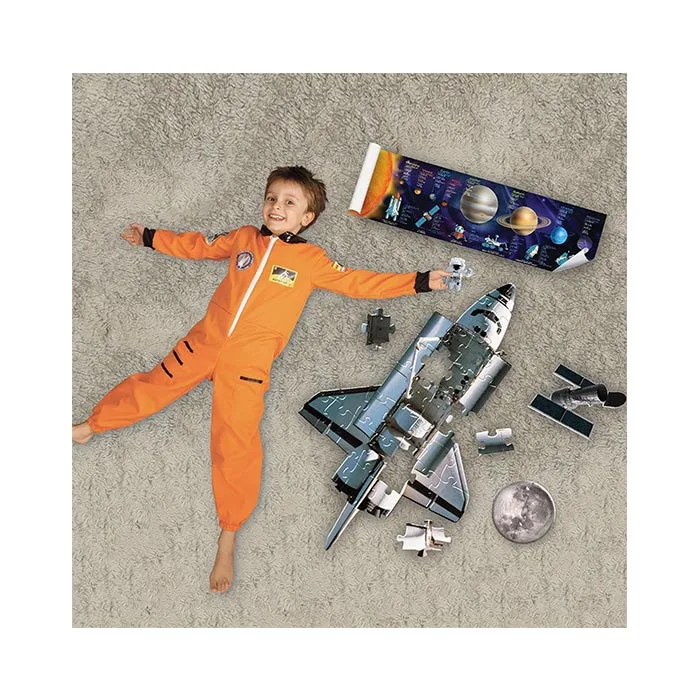 Kids can build this unique shaped floor puzzle of a space shuttle floating through space. Includes 3 extra pieces: Astronaut, The Hubble Telescope and Moon.