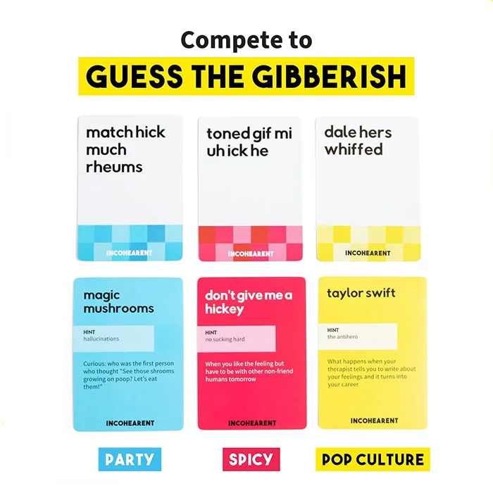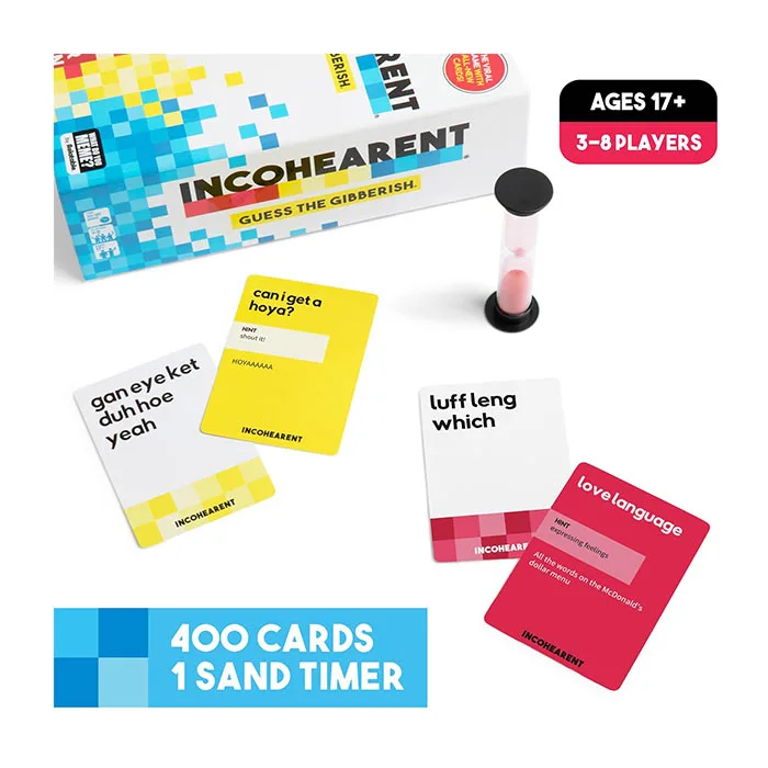 Laugh Out Loud with Incohearent by What Do You Meme? Dive into a fast-paced party game where players compete to decipher wildly funny gibberish phrases drawn from pop culture references. Designed for 2 or more players, this game is perfect for gatherings where quick wit and laughter are the main goals.