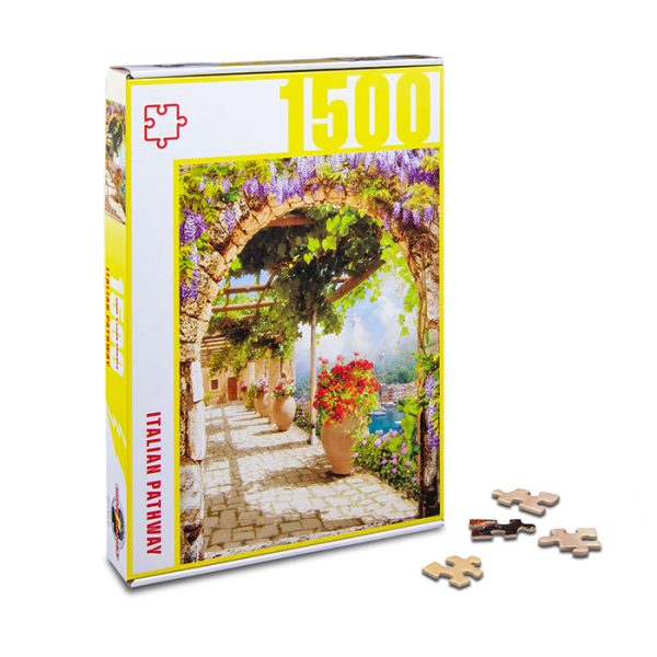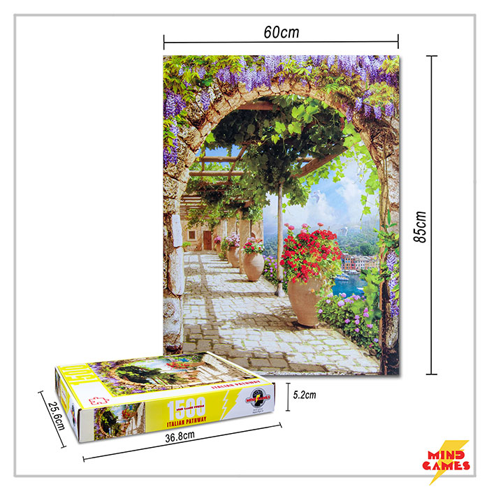 Italian Pathway is a 1500 pieces jigsaw puzzle from Mind Games. This challenging puzzle is made of high quality cardboard and snaps together easily with a precise fit.