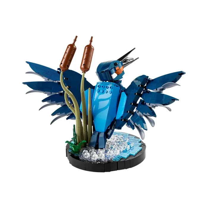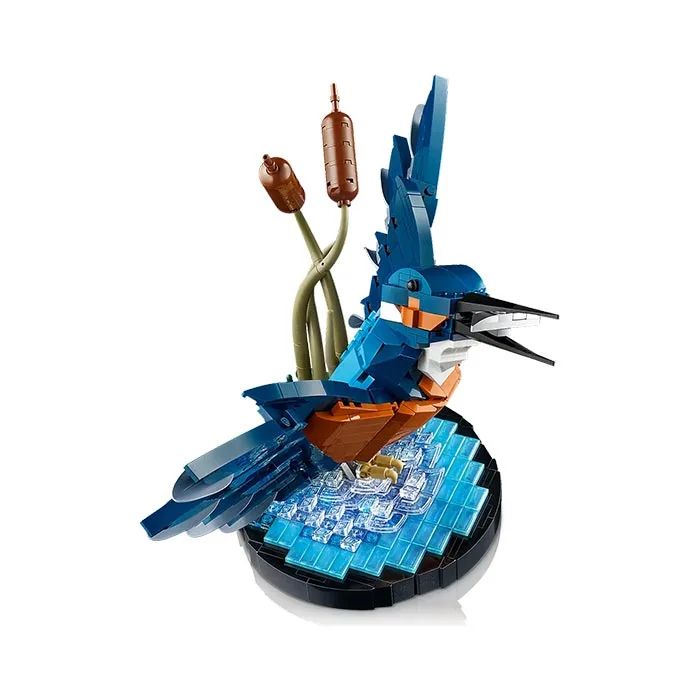 The kingfisher model depicts the bird, known for its striking plumage and remarkable hunting abilities, emerging from water with a fish catch. The water setting includes buildable reeds and doubles as a display stand. Position the bird’s head and claws to create your favorite pose before placing it on display for all to enjoy.