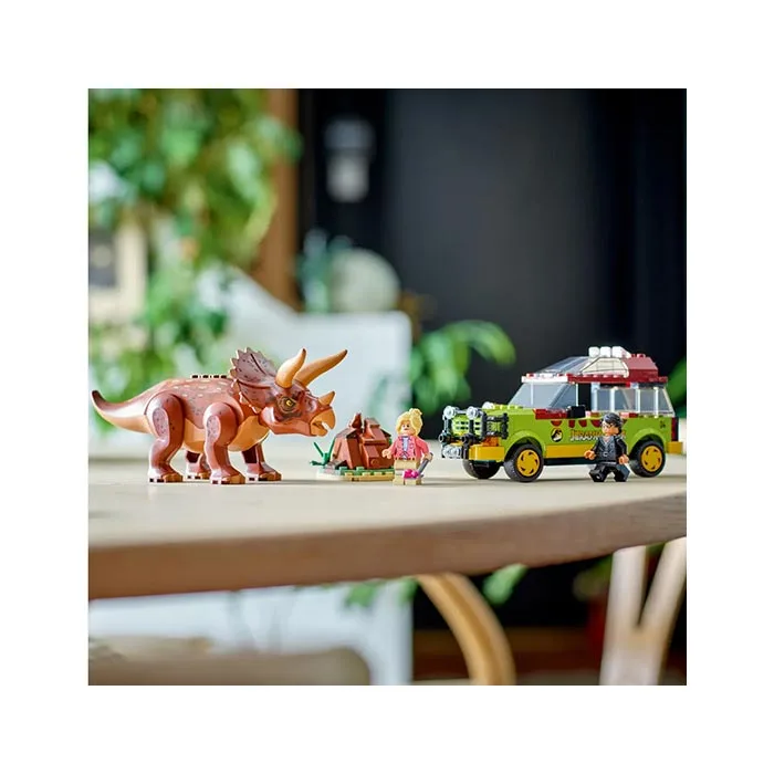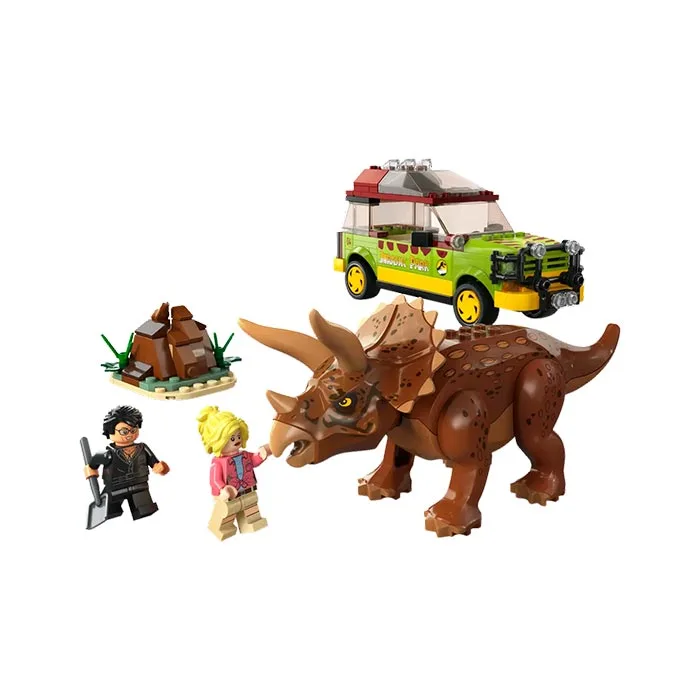 - Toy dinosaur and 2 minifigures – A posable Triceratops figure, plus Ian Malcolm and Dr. Ellie Sattler with a shovel element to scoop the hidden toxic berry element from the buildable dinosaur poop