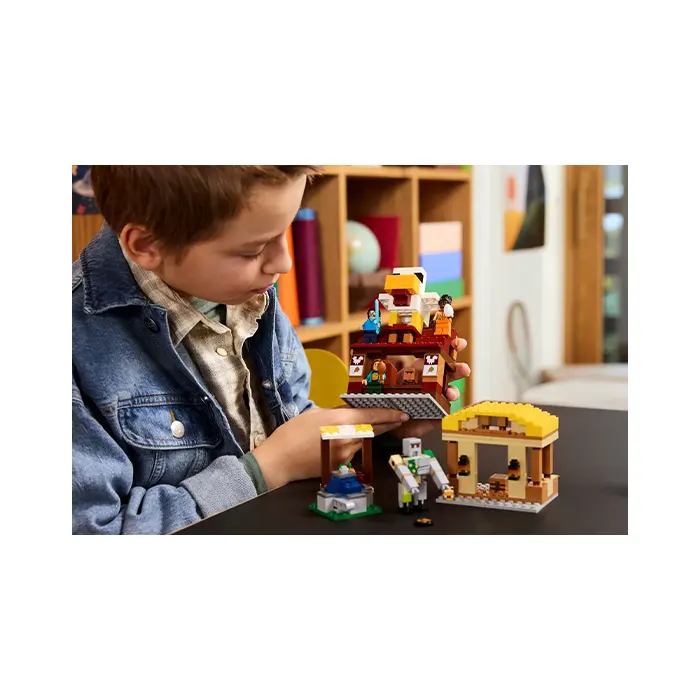 - Video game LEGO set – When piglins launch missiles from their ghast balloon, causing the fountain to ‘explode’, kids must defend the villagers and Steve’s fried chicken restaurant and crafting shack