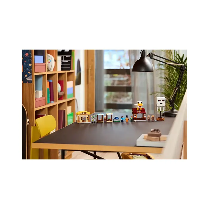 The set features popular characters from the video game: Steve, Natalie, Dawn, 2 piglins, a ghast balloon, villager, baby chicken and a posable iron golem figure. The balloon has room for the piglins and incorporates a disc shooter. Set amongst the village are market stalls, Steve’s fried chicken restaurant, his crafting shack and a fountain, which kids can ‘explode’ using a built-in feature. The restaurant’s roof is topped with a large chicken model that includes a fun egg-laying function. For digital fun, the LEGO Builder app lets kids zoom in, rotate models in 3D and track their progress.