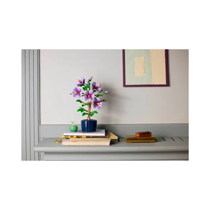 Enjoy building the LEGO plant, which features 5 large blooms, 4 flowers that are about to blossom and 2 young flower buds, before discovering the details. Capturing the gentle beauty of nature, the large blooms have lavender-colored petals and yellow stamens, while the leaves are pale green. Once you’ve finished building the hibiscus, you can move the petals and position the leaves to add a touch of customization to your creation.