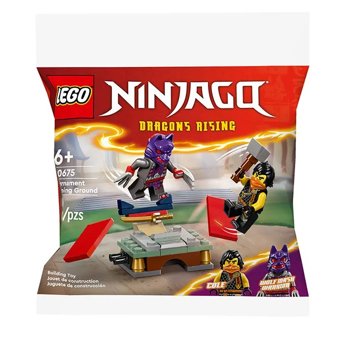 Ninja playset lets kids role-play battles between Cole, armed with a katana sword accessory, and a Wolf Mask Warrior with its claws to win a golden staff.