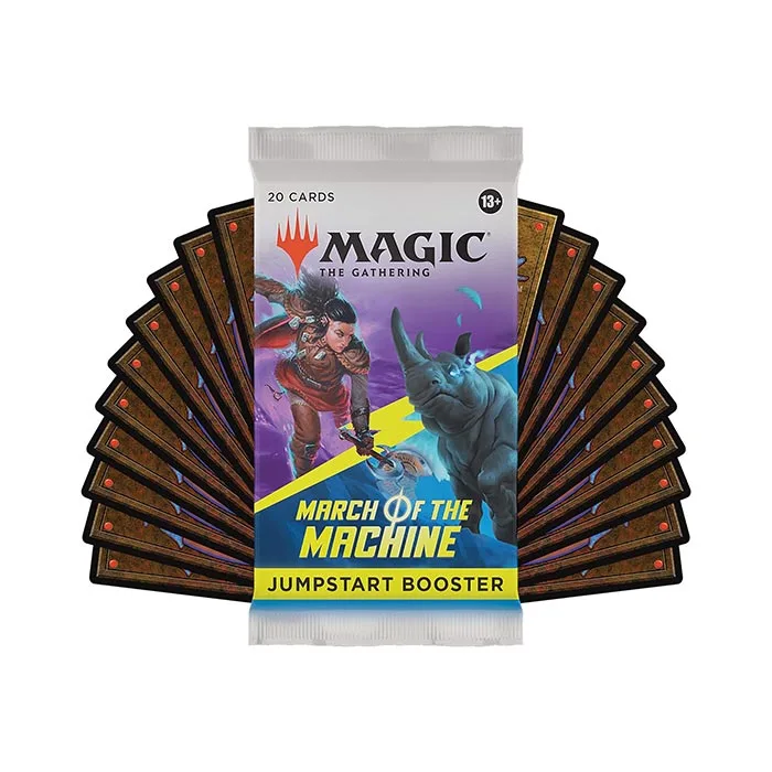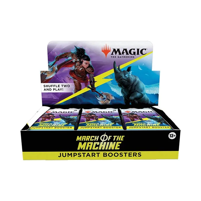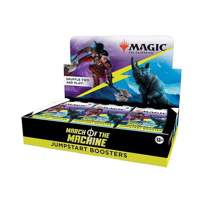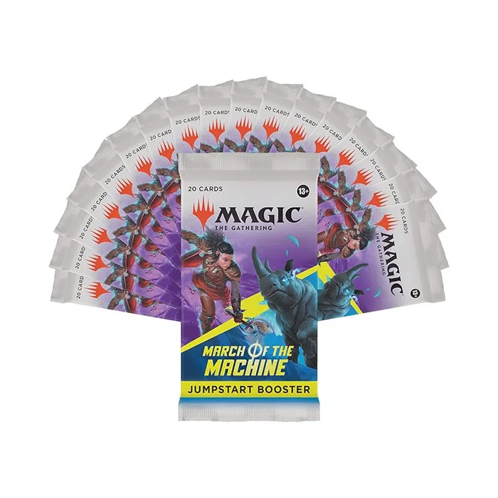The March of the Machine Jumpstart Booster Box contains 18 March of the Machine Jumpstart Boosters. Each booster has a theme. Just grab two packs and shuffle them together for wild combos and a unique gameplay experience that’s great for a quick game, for long-time fans looking to jump back in, or for a fun, approachable way to learn the game.