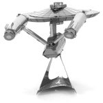 Now you can have your very own 3-inch-tall USS Enterprise with the Metal Earth Star Trek USS Enterprise NCC-1701. This amazingly detailed DIY model starts as a 4″ laser-cut square steel sheet, and finishes as a beautiful 3D model. Use the easy to follow instructions to pop out the pieces, bend the tabs, and connect them at the attachment points.