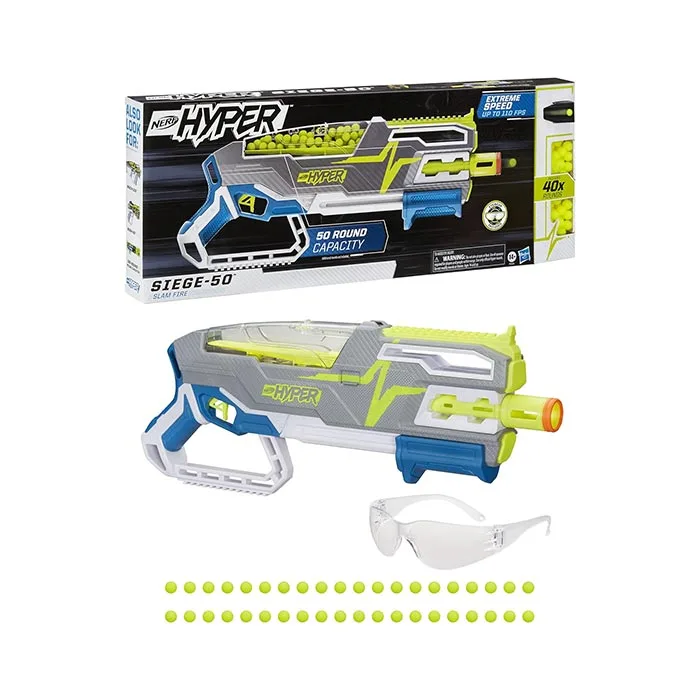 The rounds maximize speed and capacity with their innovative design and material. Round reload canisters attach to tactical rails for fast, easy reloads. The pump-action Nerf Hyper Siege-50 blaster includes 40 Nerf Hyper rounds and has a large, 50-round capacity hopper.