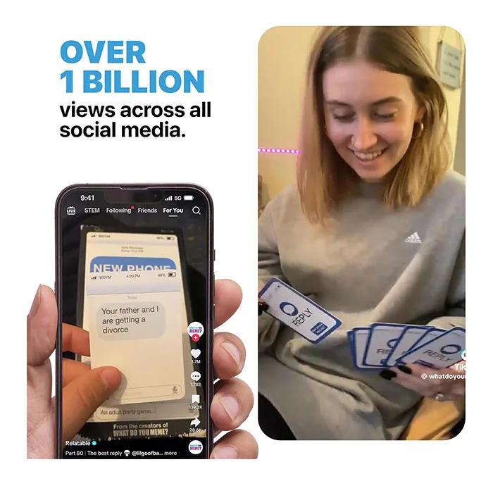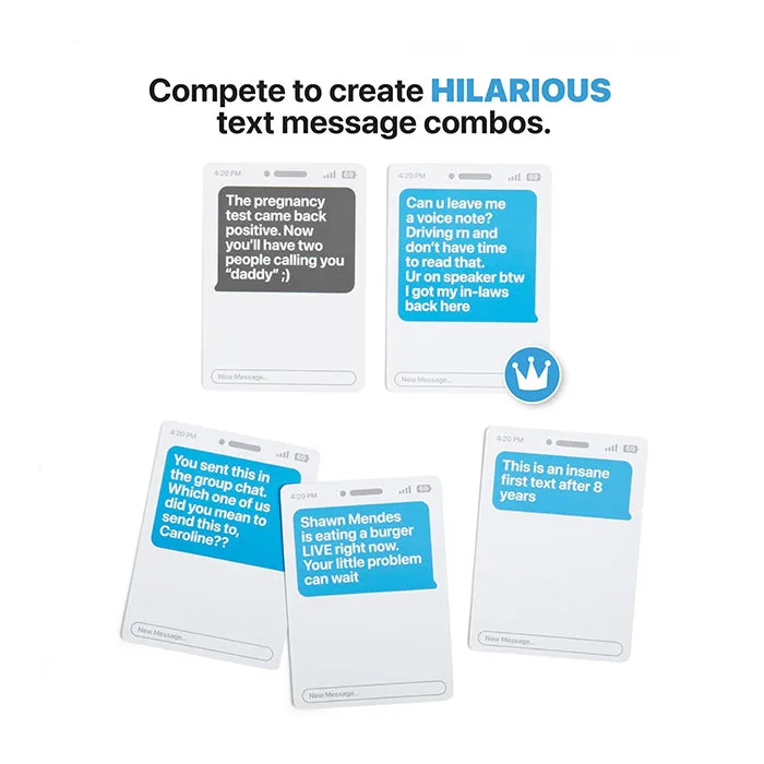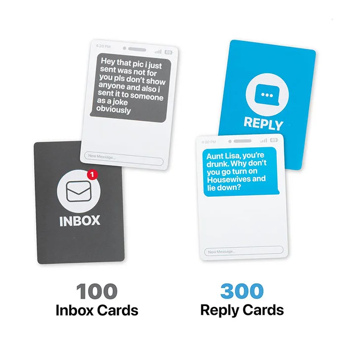 This is the 100% offline text message party game where players compete to create the funniest text message thread. HOW TO PLAY: Players rotate drawing a sent (orinbox) card while the rest of the group competes to play the funniest reply card. Once everyone in the group has played their chosen reply card, the judge decides which combo is the funniest.