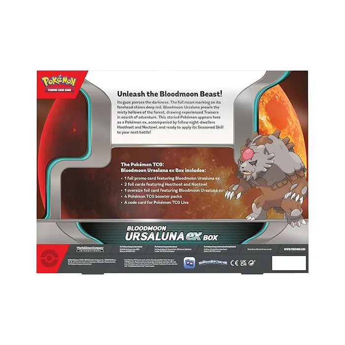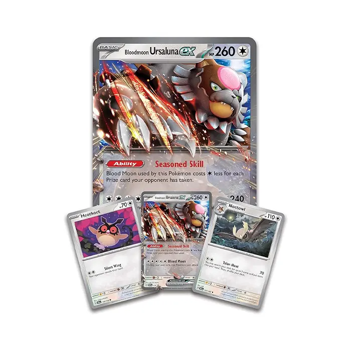 Its gaze pierces the darkness. The full moon marking on its forehead shines deep red. Bloodmoon Ursaluna prowls the misty hollows of the forest, drawing experienced Trainers in search of adventure. This storied Pokémon appears here as a Pokémon ex, accompanied by fellow night-dwellers Hoothoot and Noctowl, and ready to apply its Seasoned Skill to your next battle.
