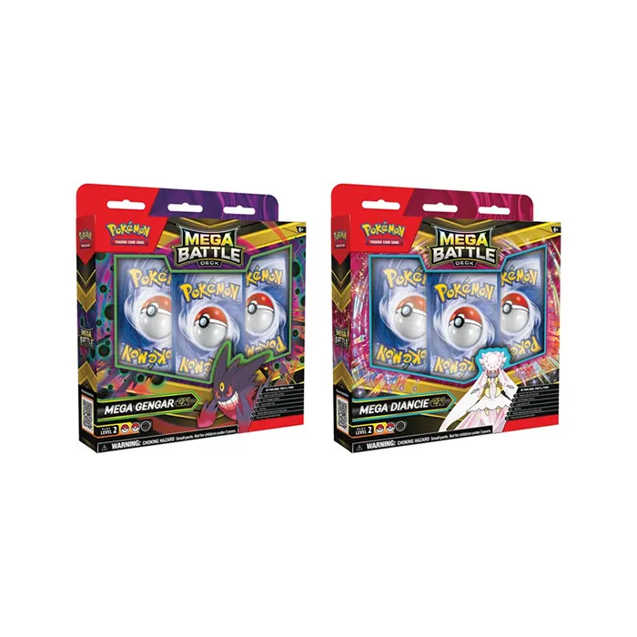Two new Pokémon TCG: Mega Battle Decks are ready to rumble! Team up with Mega Gengar ex and battle from the shadows, or call upon Mega Diancie ex and dazzle opponents with your skill. Each deck includes a powerful Pokémon ex and everything you need to play right away. These items are random, and you may receive Mega Gengar ex OR Mega Diancie ex Display.