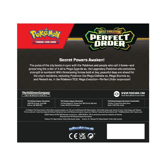 The pulse of the city beats in sync with the Pokémon and people who call it home—and preserving the order of it all is Mega Zygarde ex, the Legendary Pokémon who embodies strength in numbers! With threatening forces held at bay, peaceful days are ahead for the city’s residents, including Pokémon like Mega Clefable ex, Mega Starmie ex, and Meowth ex, in the Pokémon TCG: Mega Evolution—Perfect Order expansion!