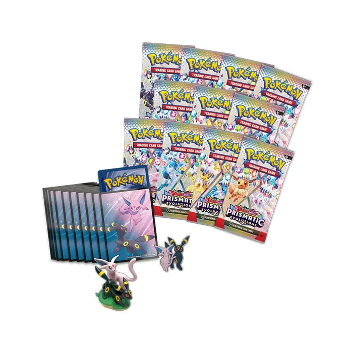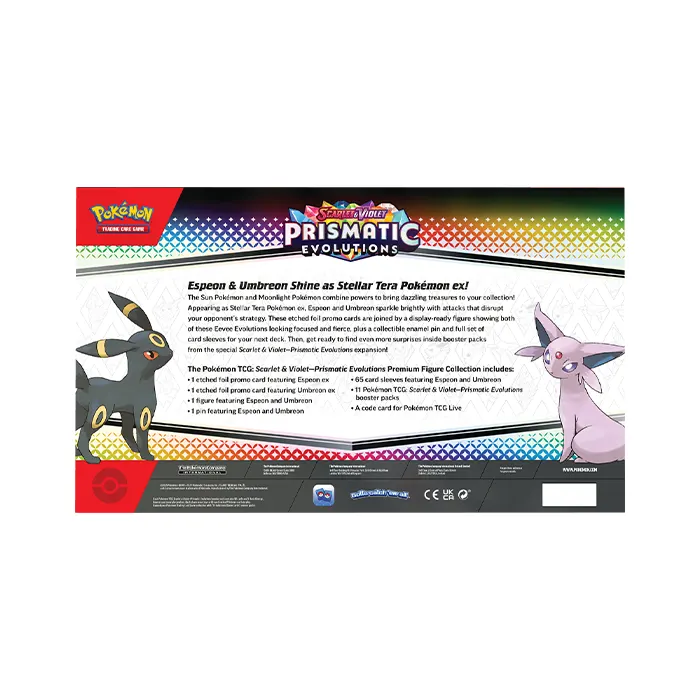 The Sun Pokémon and Moonlight Pokémon combine powers to bring dazzling treasures to your collection! Appearing as Stellar Tera Pokémon ex, Espeon and Umbreon sparkle brightly with attacks that disrupt your opponent’s strategy. These etched foil promo cards are joined by a display-ready figure showing both of these Eevee Evolutions looking focused and fierce, plus a collectible enamel pin and full set of card sleeves for your next deck. Then, get ready to find even more surprises inside booster packs from the special Scarlet & Violet—Prismatic Evolutions expansion!