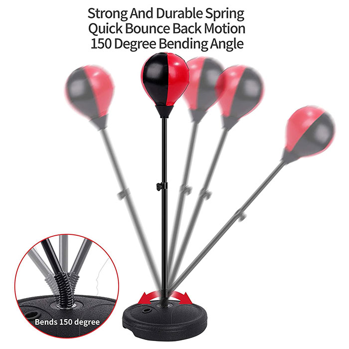 We use best material to make it more durable. This strong punching bag can withstand onslaught of kicks and punches, and will bounce back immediately with no wear or tear. It still keeps a smooth & seamless surface to avoid skin damage even after thousands of hits. This boxing bag is a fun and enjoyable for kids to exercise that helps release stress & depression in an athletic and safe way and built self-confidence. The punching bag helps children strengthen physical fitness and relieve energy, increasing children’s interest in exercise and reducing screen time. This cute beginner home boxing punching bag is suitable for 5 years old and up boys & girls to practice martial arts & karate taekwondo. You could have a great practice time with kids. This punching bag set is a perfect toy gift for kids of all ages and occasions. Strong and Durable Spring quickly bounces back with the motin. It has a 150 degree banding angle.