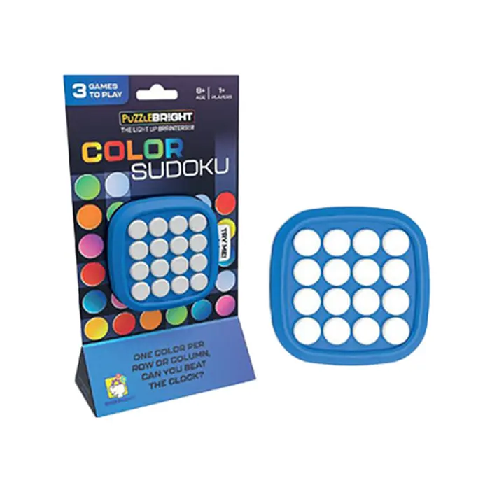 One of the best games of all time now fits in the palm of your hand! In Color Soduko, the colors only appear once in a row or column. Can you find the missing colors in time! Challenge yourself with three levels of difficulty. Features 16 MultiÂcolored LED Lights & Sounds!