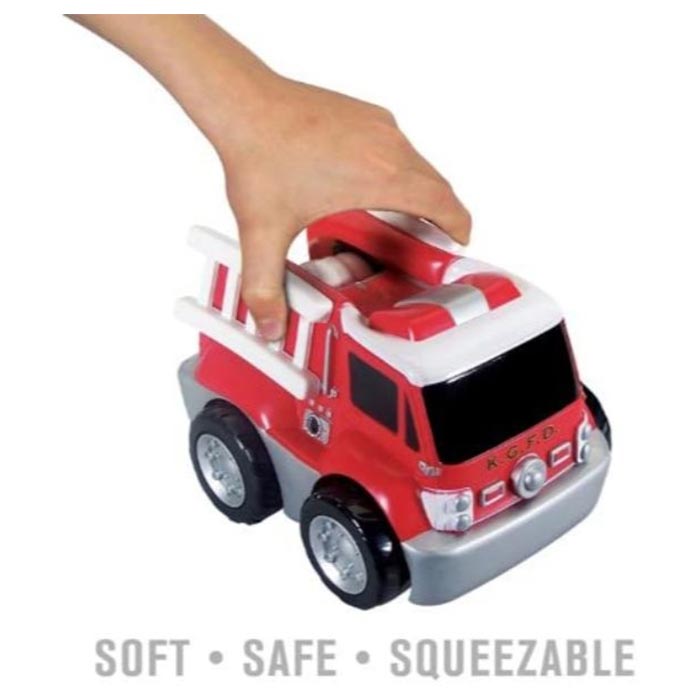 Putting out fires in a neighborhood near you! Squeezable, soft, and chunky in shape, it is perfect for little hands. Made in a safe, child friendly design and controlled by a simple function remote. Push the button up and the truck goes straight. Push the button down and it spins in circles. Safe for toddlers, furniture, and walls.