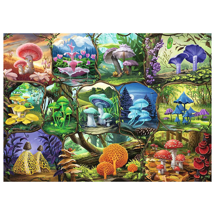 Delve into the nature kingdom and some much-deserved peace and quiet while piecing together an artful array of fanciful fungi! Did you know there are over 10,000 known species of mushrooms, aka toadstools? Mycologists those cool people who study fungi believe there are thousands more yet to be discovered! Our vibrant illustration features fifteen distinct microcosms – a perfect puzzle for super-sorters or anyone ready to dig into some stress-free, brain-happy me time!