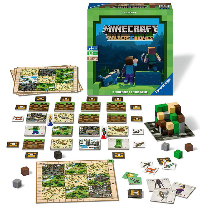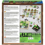 The box contains 64 resource cubes, 64 building and monster cards, 36 weapon tokens, 4 player boards, 4 experience counters, 4 character skins, 4 game piece bases, 12 overview cards, 1 resource cube base, 1 support structure, and instructions.