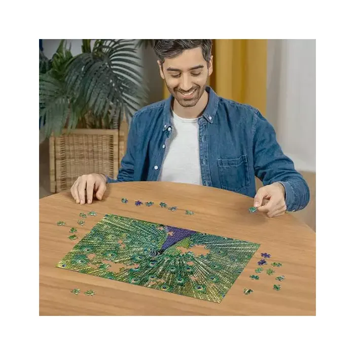 The puzzle’s image captures the radiant plumage of a peacock, with jewel-toned greens, deep blues, golden highlights, and detailed feather patterns that mesmerize from every angle. Each section offers visual depth, making the build both captivating and satisfying.