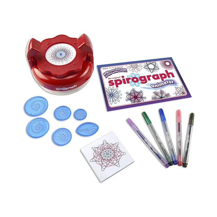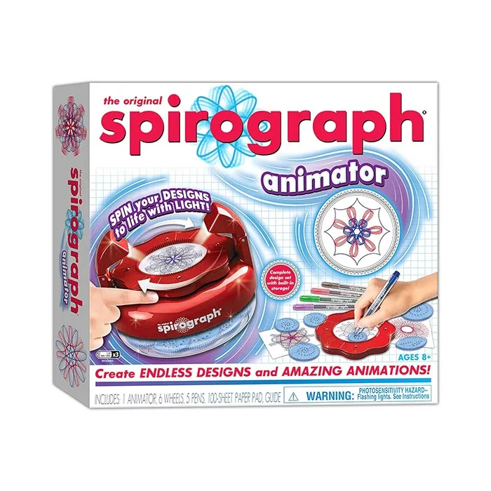 Take a new spin on the classic Spirograph design set with Spirograph Animator! The classic way for aspiring artists to create millions of amazing designs is back and better than ever! Create endless spiral art designs and then bring them all to life in amazing, mesmerizing motion with the spin of the animator.