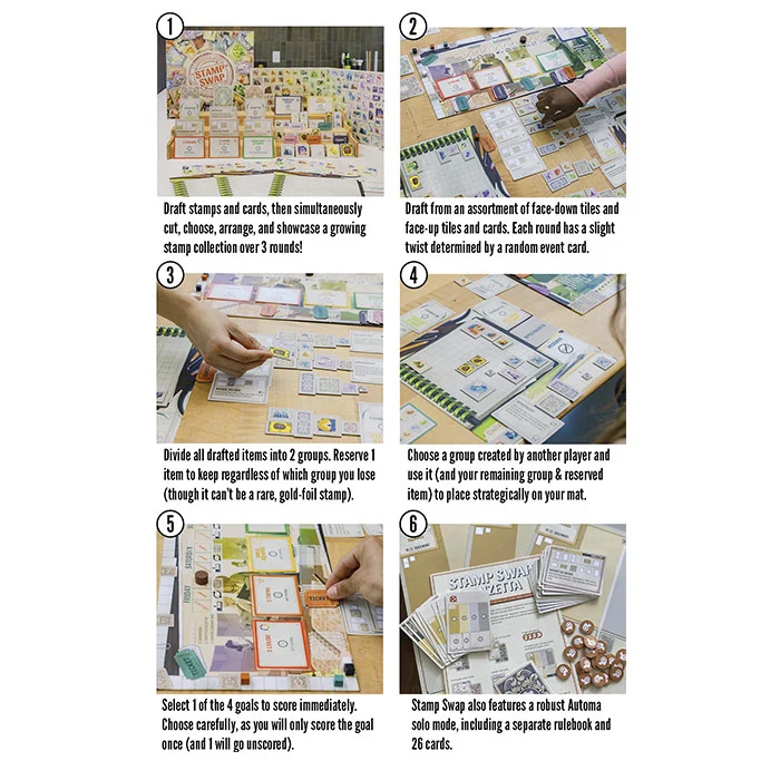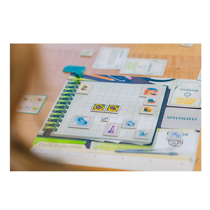 Designer Paul Salomon (Honey Buzz, Genotype) brings stamp collecting to life on tabletops in Stamp Swap! Draft from a public pool of face-down and face-up tiles (along with some bonus cards), then divide them into 2 groups. You will select one group from another player and keep the group of yours that isn’t selected. Organize your growing collection each round and score 1 of 4 goals choose wisely, as you can’t score that goal again. The art of stamp collecting is not just in accumulating many stamps, but in collecting high-quality stamps (including rare gold-foil stamps). This 3-round game for 1-5 players is your chance to meet other attendees, assemble a beautiful and well-focused stamp collection, and show it off in a series of contests.