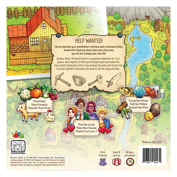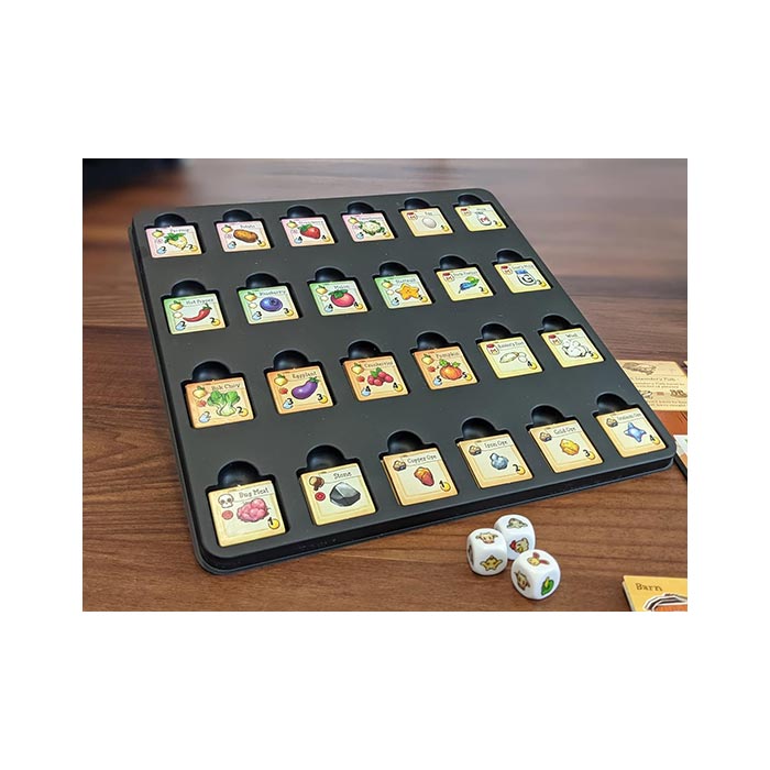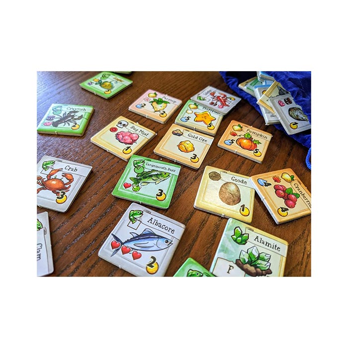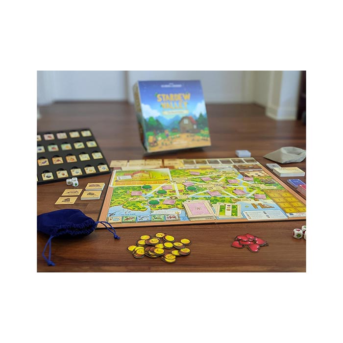 84 season cards, 31 villager cards, 8 grandpa goals, 26 bundle cards, 19 tool upgrade cards, 50 item cards, 48 crop tiles, 60 forgeable tiles, 40 artifact/mineral tiles, 24 animal product tiles, 16 ore/geode tiles, 60 fishing tiles, 21 gold tokens, 1 game board, 1 fishing bag, 1 mineral bag, 4 player mats, 3 animal dice, 3 Stardew dice, 1 spouse pawn, 4 player pawns, 1 rulebook, 10 heart tokens, 13 Joja tiles, 38 event cards, 16 mine event cards, 17 epic item cards, 64 profession upgrade cards, 9 building tiles, 4 bug meat tiles, 4 stone tiles, 1 organizer, 1 tile tray .