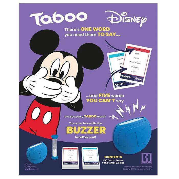 Disney Taboo is the game of unspeakable fun! Who can get their teammates to say “Tinker Bell” without being able to say Fairy, Pixie Dust, Wings, Fly, or Dress? When playing the Taboo game, the obvious clues are strictly forbidden. Players race against the timer as they try to give creative and carefully-worded clues to get team players to guess words fast. But don’t mention the Taboo words, or your team will lose the point.