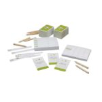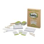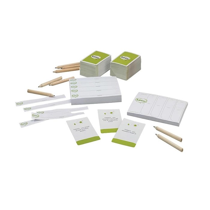 The Game of Things comes packaged in a wooden box with a sliding lid and contains 300 topic cards, 1 answer pad, 1 score pad and instructions. Things is recommended for 4 or more players, and takes approximately 1 hour to play.