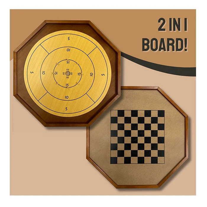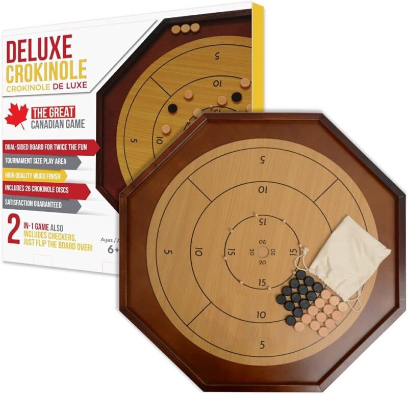 Crokinole dates back to the 19th Century as a game from rural Canada. Engage with the Canadian heritage game at your own home with this 2-in-1 crokinole game set. The discs are made from wooden materials and finished to provide just the right amount of friction. The natural wood crokinole board has crokinole scoring numbers on the playing surface and you can reverse the board to play chess or checkers. The playing area has a smooth surface and is a standard size crokinole board. Made from quality materials and well finished to provide the right amount of friction. It’s the perfect board game set for family game night, office break room tournaments, pub games, and bar fun. Standard 2-in-1 crokinole board game set for beginners and families. This crokinole board is durable and ideal choice for those who are looking to learn how to play the heritage crokinole game. This 2-in-1 standard game set includes 2 sided crokinole board and 26 crokinole discs.
