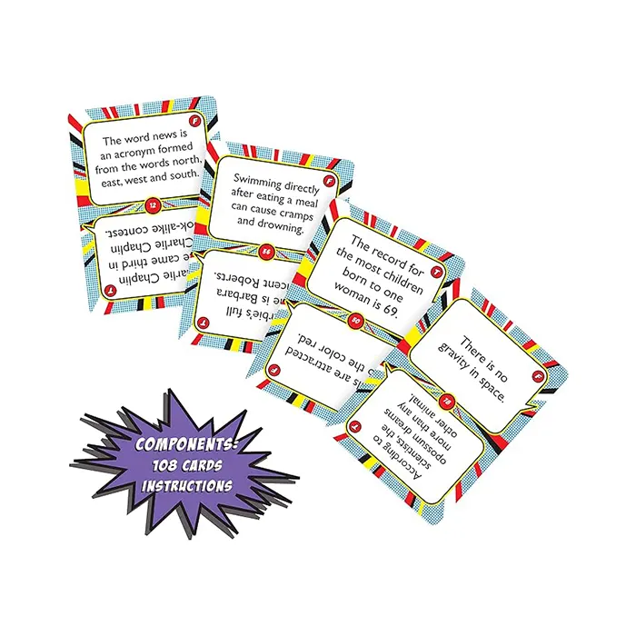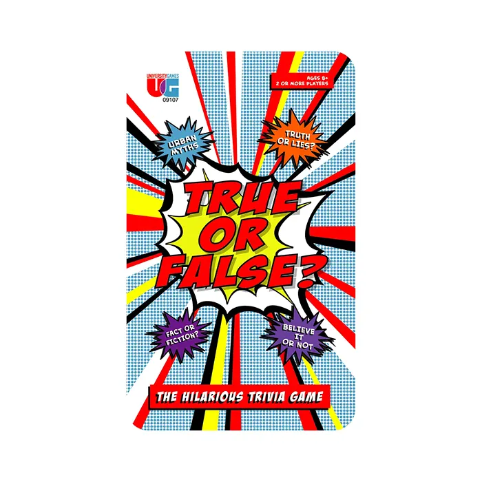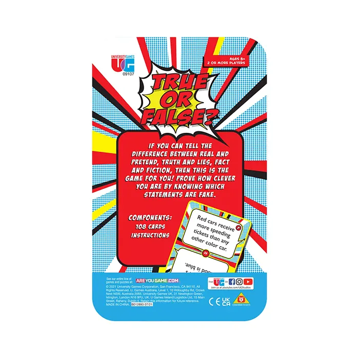 If you can tell the difference between real and pretend, truth and lies, then True or False? is the game for you? Test your cleverness by determining which statements on the playing cards are true or false. Correct answers earn you cards, and the player with the most cards after 10 rounds wins. This easy-to-play trivia game is perfect for game nights, family gatherings, or a fun laugh with friends. Packaged in a convenient travel tin, it’s also ideal for road trips or outings!