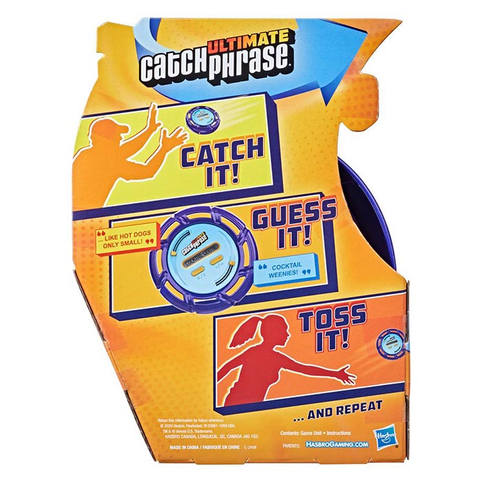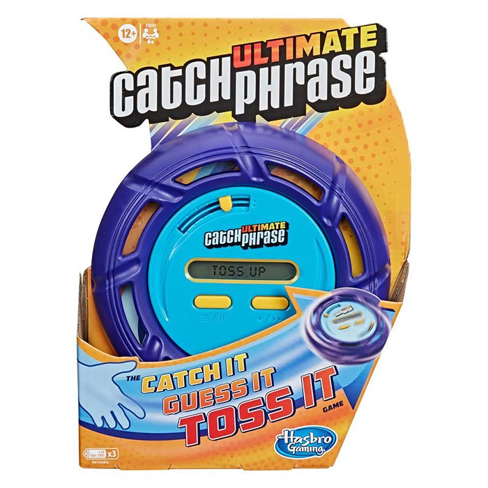 The Ultimate Catch Phrase game unit is designed so that players can toss it instead of passing it — putting the “catch” back into Catch Phrase! Players try to get teammates to guess the word or phrase that appears on the screen by describing it in just about any possible way — but they have to do it fast as the timer counts down! If a teammate can’t guess the word within 15 seconds, the unit will beep and it’s time to toss it to another team member who’ll get a chance at a new word. Don’t get caught holding the unit when the buzzer goes off or your team loses the round and the other team gets the point. The Ultimate Catch Phrase electronic party game features 5,000 words never seen in previous Catch Phrase games. Categories include: Around the World, Fun and Games, On the Air, Snack Time, and The Great Outdoors.