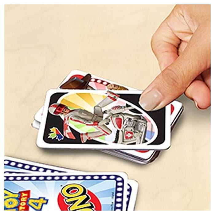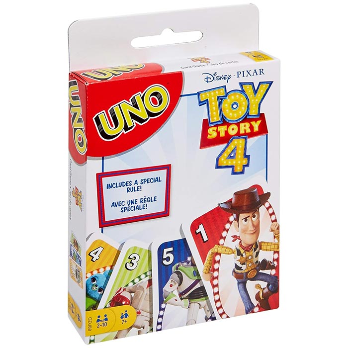 It’s the classic card game you know, now with an exciting Disney/Pixar Toy Story 4 theme! Based on the highly anticipated family film, this UNO deck features cards with images of your favorite Toy Story 4 characters, plus the Duke Caboom Wild Card! When played, Duke will “crash” into two other players of your choice. Pick two players, mix their cards together and deal them back out equally to each player.